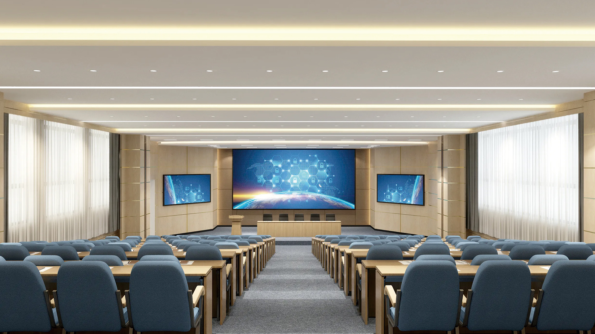 多功能厅是现代会议需求产物,它打破了传统单一“讲堂式”的会议布置格局,能在不改变会议地点的情况下,能满足主办方改变和增加会议的内容,丰富会议形式的室内建筑体。