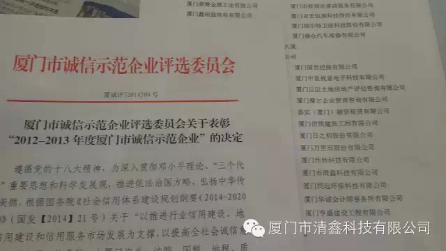 2015年3月27日《厦门市诚信示范企业表彰大会》在厦门人民大会堂多功能厅隆重召开!通过评选委员会成员单位的严格评选,厦门市清鑫科技有限公司荣获诚信示范企业。在由《清鑫科技》设计承建的音响及视频系统会场获得殊荣对我们公司更是一种责任与勉励!我们将以诚信为企业基本准责服务于社会!