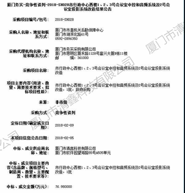 近日,清鑫收到中标通知书,公司中标“市行政中心西楼1、2、3号会议室中控和音频系统及2号会议室投影系统改造 ”。此次项目的中标,是清鑫努力的结果,也是厦门市市直机关保障中心及各位专家对清鑫的认可。