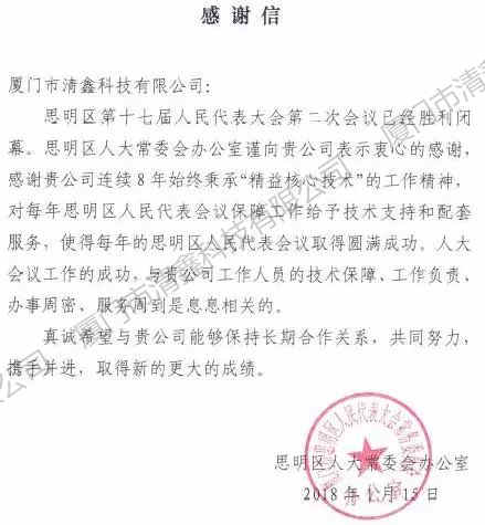 该项目的顺利中标,是对清鑫在智能会议室系统专业上的肯定,也是对清鑫团队能力的肯定,促进清鑫在智能会议室系统的建设、投资与运营等方面的更好发展。2018年,清鑫将以“有技术的视听平台服务商”的标准严格要求自己,秉承“精益核心技术”的态度,服务广大客户!